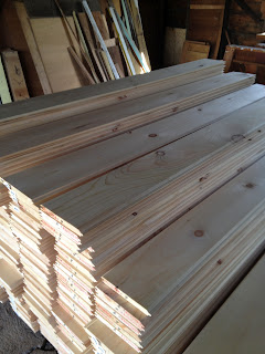 Did I mention that after we decided to do the pine beams, Matt and I also decided to use low grade pine for the floors? I know it dings, but that will add to the "old farmhouse" look we are going for. Matt spent Monday driving 5 hours to pick up the pine. We found it at 99 cents a square foot, so it was worth the price of gas. And let me tell you, it is beautiful. I love the look of pine and I know I am in the minority, but I could spend hours looking at the knots and grain. I can't wait to see it in layed down... But that will be a while. I have a lot of work ahead of me before installing floors. I snapped a pic of the wood to share while it patiently waits in the garage...